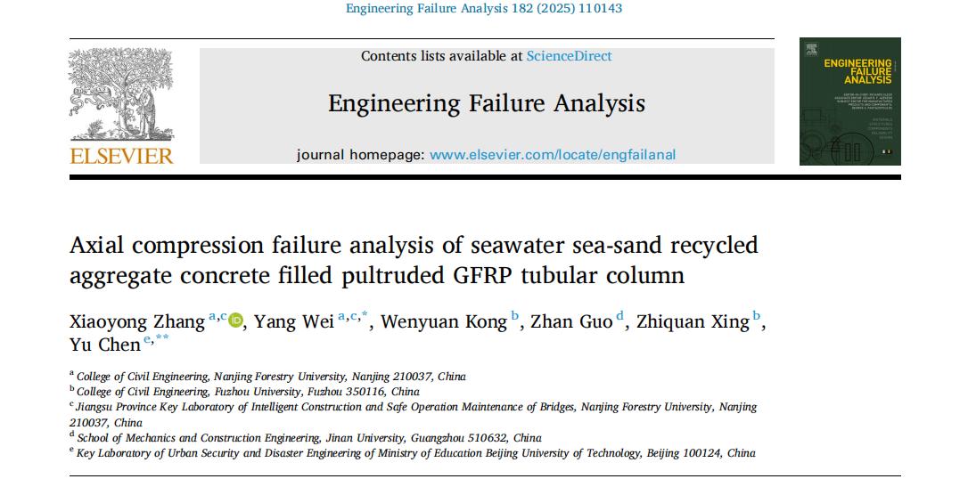 近日,日本做爱 张晓勇老师在结构工程领域国际权威期刊《Engineering Failure Analysis》(中科院2区)发表了研究成果(Axial compression failure analysis of seawater sea-sand recycled aggregate concrete filled pultruded GFRP tubular column)。张晓勇老师为第一作者,魏洋教授和北京工业大学陈誉教授为通讯作者,日本做爱 为第一完成单位。该成果得到了国家自然科学基金和江苏省自然科学基金等项目的资助。