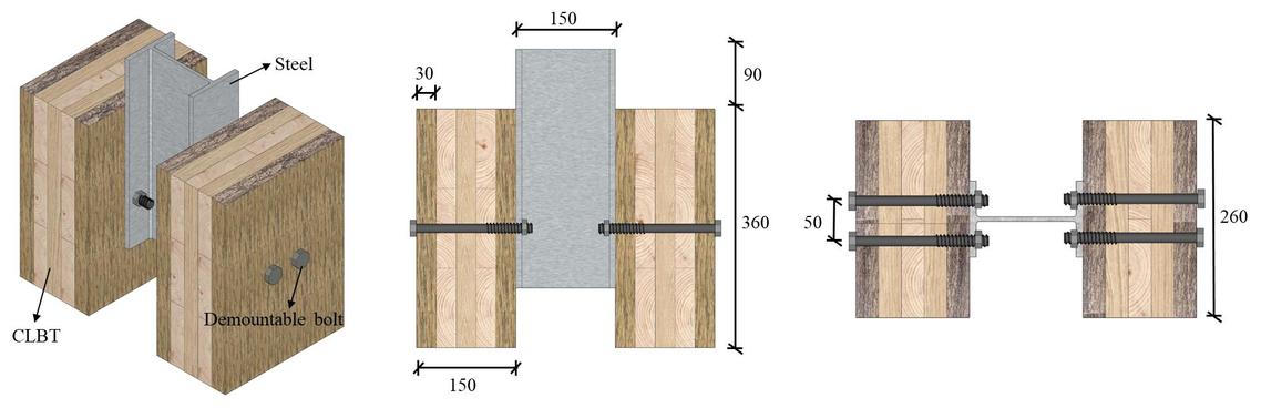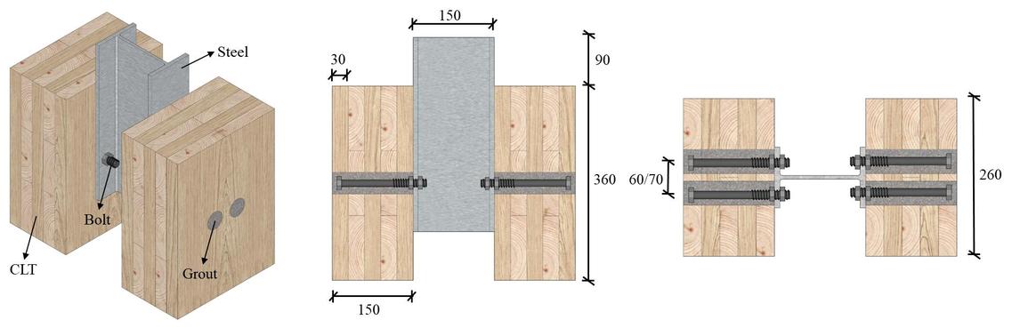 钢-木组合(STC)结构结合了木材的轻质与环保特性,以及钢材的高强度和良好延性,使其成为钢筋混凝土结构的可持续替代方案。随着木材加工技术的发展,正交胶合木(CLT)逐渐成为现代木结构建筑中广泛应用的一类工程木质产品。CLT兼具双向力学性能和良好的尺寸稳定性,成为开发STC结构的理想选择。钢-CLT组合结构协同受力的关键在于剪力连接件的抗剪性能,针对STC结构中常用机械紧固连接件存在较低的滑动刚度和明显的木材嵌入变形问题,本研究提出了嵌入灌浆层的高强螺栓连接技术。