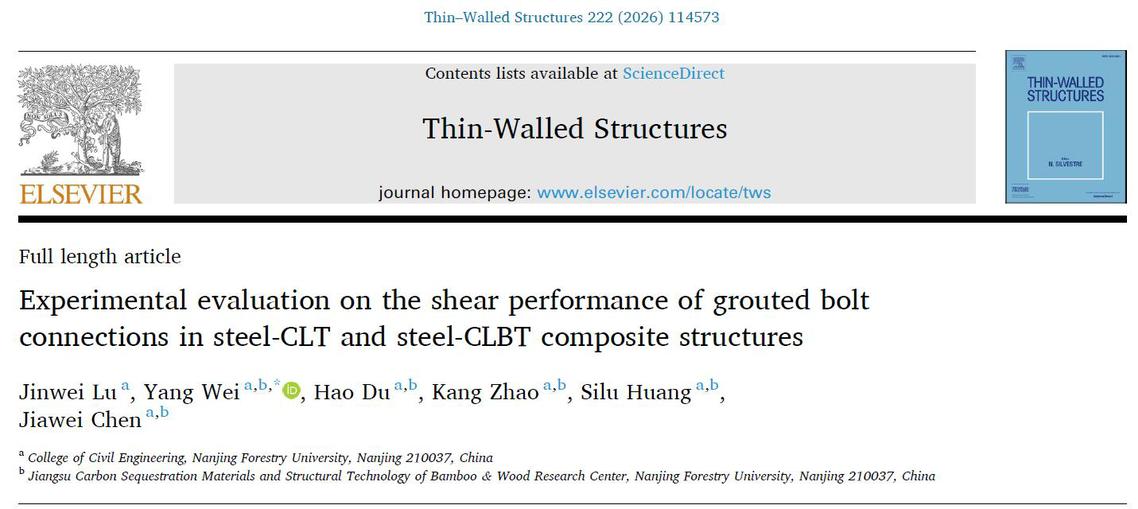 近日,日本做爱 魏洋教授团队在土木工程领域国际权威期刊《Thin-Walled Structures》发表了最新研究成果(Experimental evaluation on the shear performance of grouted bolt connections in steel-CLT and steel-CLBT composite structures)。博士生陆金炜为第一作者,魏洋教授为通讯作者,日本做爱 为第一完成单位。该成果得到了国家自然科学基金的资助。