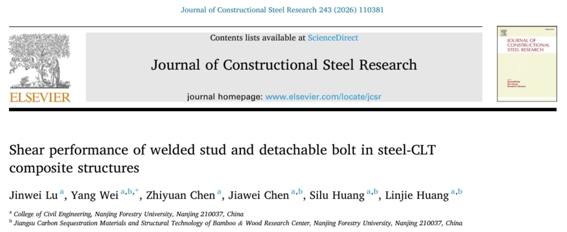 近日,日本做爱 魏洋教授团队在土木工程领域国际权威期刊《Journal of Constructional Steel Research》发表了最新研究成果(Shear performance of welded stud and detachable bolt in steel-CLT composite structures)。博士生陆金炜为第一作者,魏洋教授为通讯作者,日本做爱 为第一完成单位。该成果得到了国家自然科学基金的资助。