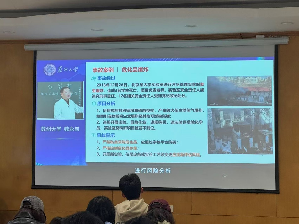 培训紧扣土木工程及其相关学科实验室特点,主题聚焦于科研实践中常见的安全隐患。赵康老师首先阐明培训意义,强调实验室安全是科研工作的底线,要求全体研究生树立安全红线意识,严格遵守安全管理规定。随后结合典型警示案例,围绕实验室操作规范、危化品管理、仪器设备使用、应急处置等核心内容系统讲解,通过事故复盘、违规操作剖析,直观呈现安全风险的现实危害,引导研究生切实增强规范操作的行动自觉。