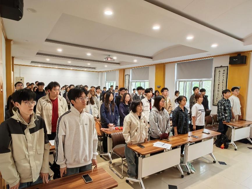 仪式在庄严嘹亮的《中华人民共和国国歌》声中正式拉开帷幕,全体人员肃立注目、齐声高唱,彰显出青年学子的崇高敬意与坚定信仰。