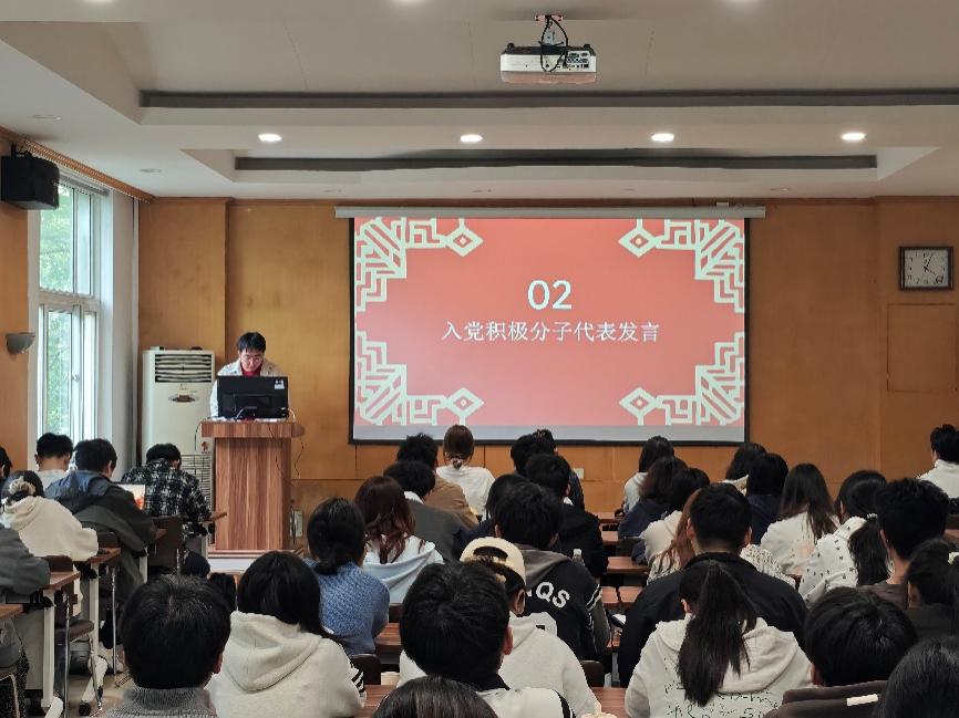 姜楠同学作为入党积极分子代表上台发言,他结合自身学习成长与思想进步历程,真诚分享了向党组织靠拢的初心与感悟,讲述了在学习生活中以党员标准严格要求自己的点滴实践。他代表全体积极分子郑重表态,将以此次培训为新起点,认真钻研党的理论知识,不断提升思想境界与综合能力,以踏实行动、优良作风向党组织靠拢,努力成长为堪当民族复兴重任的新时代青年。