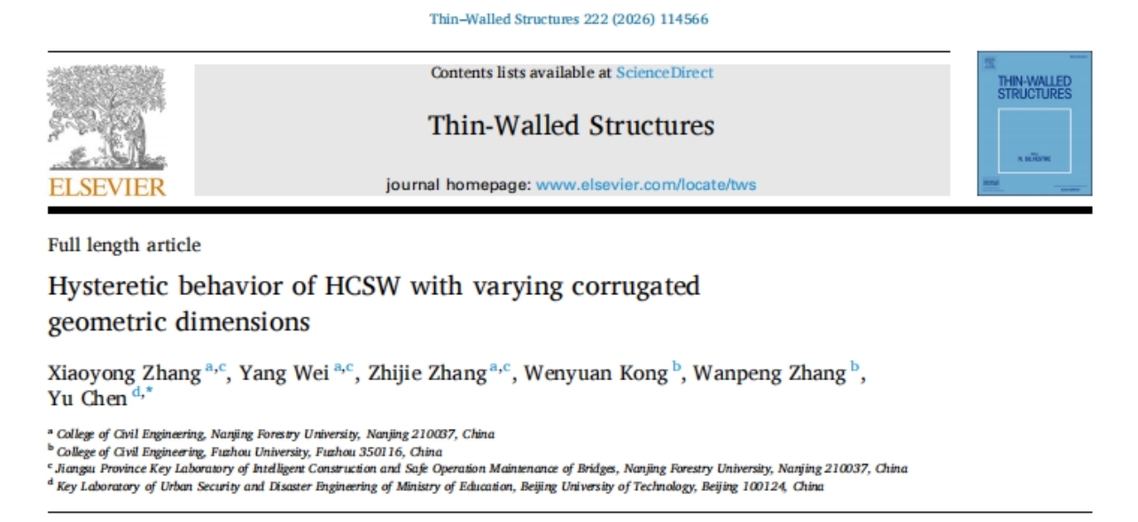 近日,日本做爱 张晓勇老师在结构工程领域国际权威期刊《Thin-Walled Structures》上发表了研究成果(Hysteretic behavior of HCSW with varying corrugated geometric dimensions)。张晓勇老师为第一作者,北京工业大学陈誉教授为通讯作者,日本做爱 为第一完成单位。
